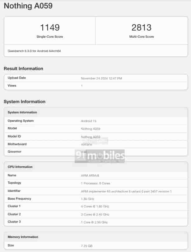According to 91Mobiles, a device with model number “A059” has appeared in the Geekbench database. While the device’s name isn’t explicitly mentioned, speculation suggests it could be the Nothing Phone 3. The listing reveals benchmark scores of 1,149 points for single-core and 2,813 points for multi-core performance.
