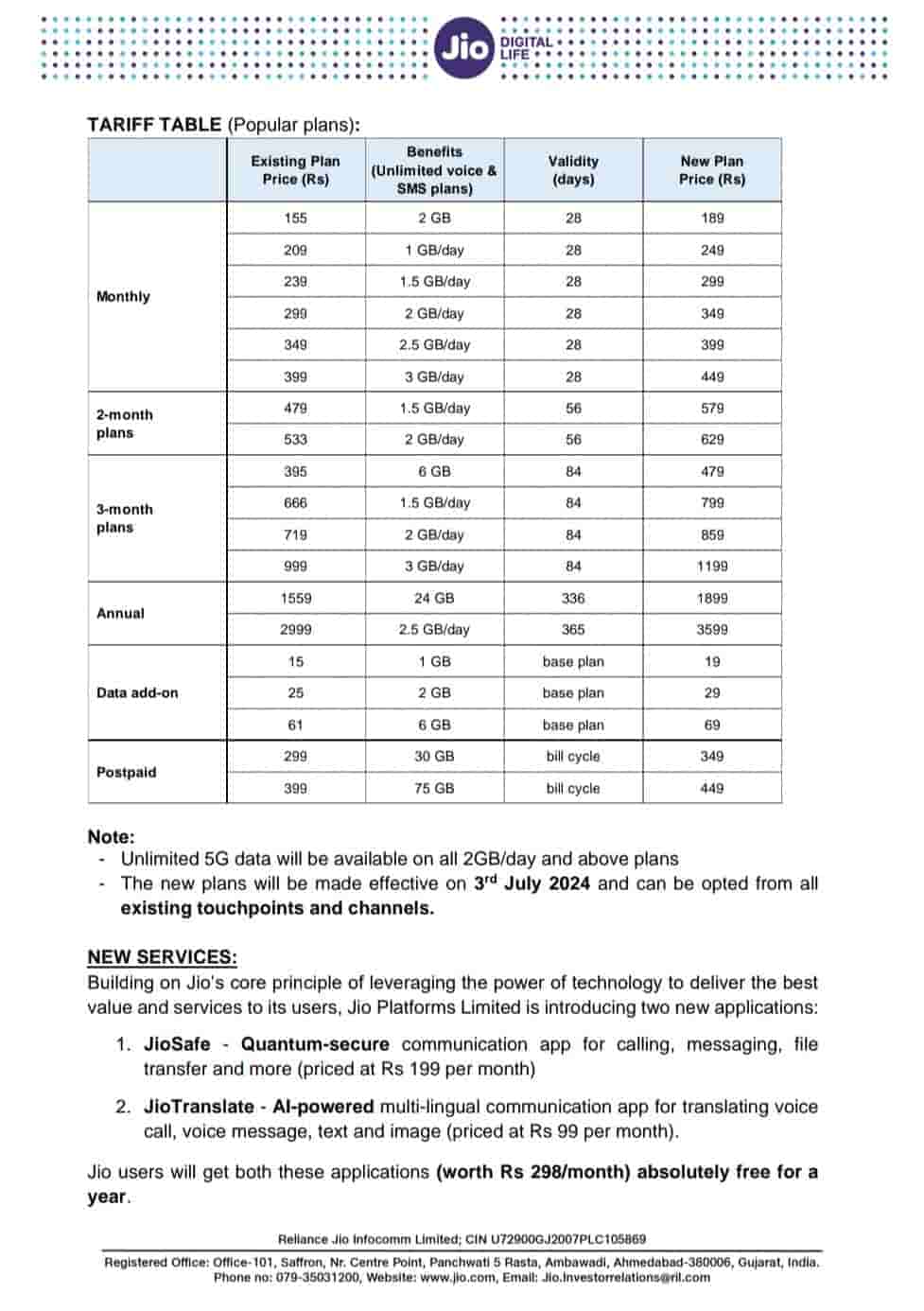 Apart from increasing the tariff company has also mentioned that unlimited 5G data will be available on all 2GB/day and above plans. Reliance Jio two new new applications have also been introduced that are JioSafe- Quantum-secure and JioTranslate. The JioSafe is a communication app for calling messaging, file transfer, and more while the JioTranslate is a multi-lingual communication app for translating voice calls, voice messages, texts, and messages. Both of these applications will be free for Jio users for a year.