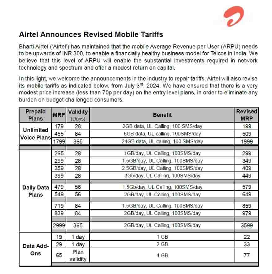 Airtel says that it has increased the price of the plans because it wants to increase the Average Revenue per User(ARPU) in “order to enable a financially healthy business model for Telecos in India”. This will help the company in making investment in network technology and spectrum. This will come into effect from July 3rd.