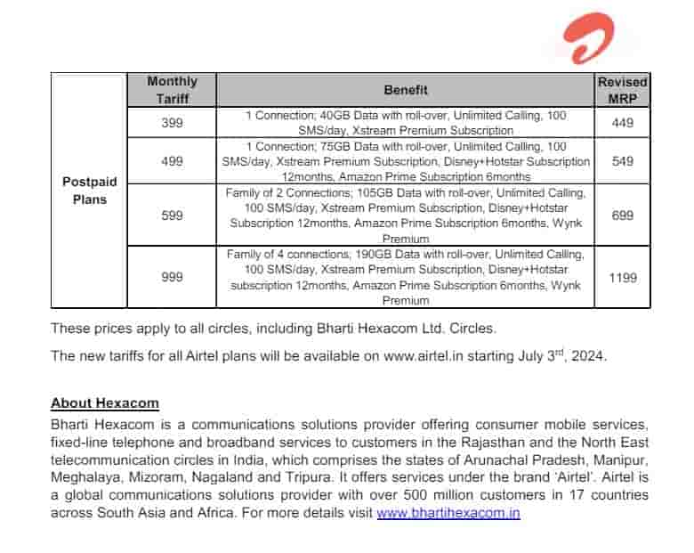 Those who subscribe to the postpaid plans will also have to pay some extra amount. The 399 plan that comes with 40GB of data and an Xstream Premium subscription will cost Rs 449. The Rs 449 plan will cost Rs 549. Prices of two other postpaid plans have also gone up Rs 599 will be available for Rs 699 and Rs 999 will be available for Rs 1199.