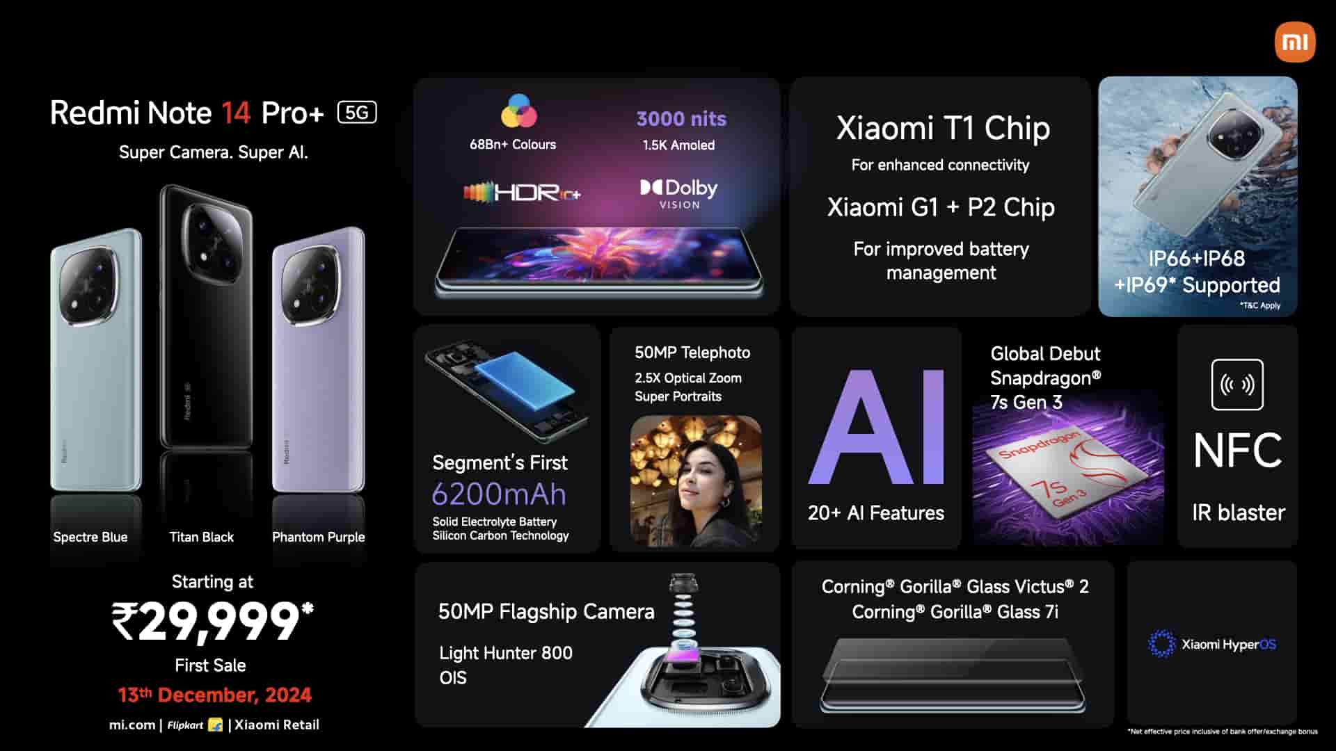 The display features of the Pro and Pro+ models are the same. It is powered by Snapdragon 7s Gen 3 SoC paired with LPDDR4x RAM and UFS 2.2 storage and runs on Xiaomi Hyper OS (3 OS updates+4 years security updates). The device packs up a 50MP main camera, an 8MP ultrawide camera, and a 50MP telephoto camera on the rear side while it is equipped with a 20MP selfie camera. It is backed by a 6200 mAh battery and supports 90W fast charging. Other features include-an in-display fingerprint sensor, Dolby Atmos support, IP66/IP68/IP69 rating, Bluetooth 5.4, WiFi 6, Xiaomi T1 chip, Xiaomi G1+P2 chip, 20+ AI features, NFC, X axis vibration motor, and IR Blaster.