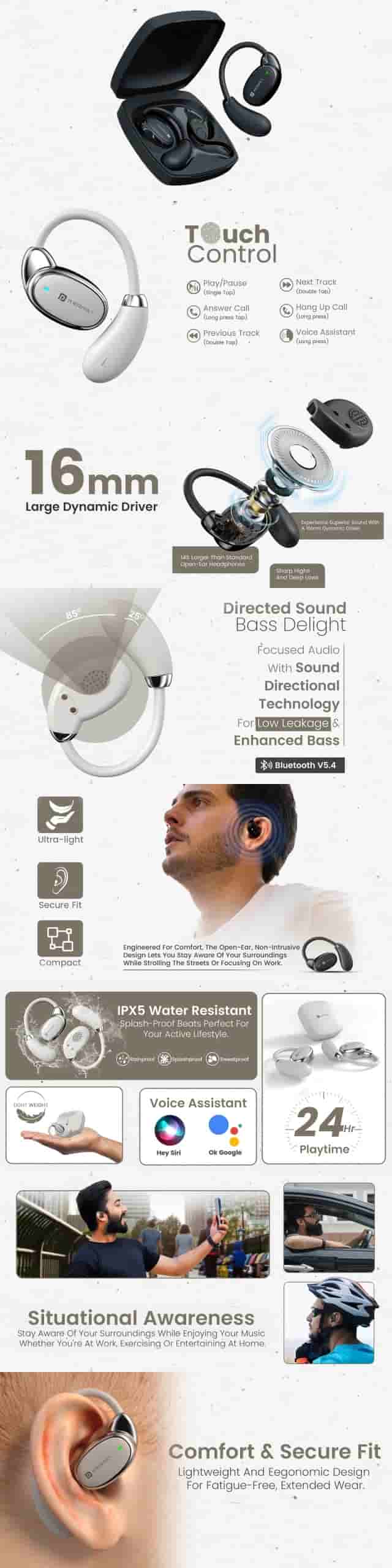 The open-ear design aims to reduce pressure on the ears and allow users to remain aware of their surroundings. An over-the-ear anchor is included to help keep the earbuds in place during physical activities. The earbuds use Bluetooth v5.4 for connectivity.