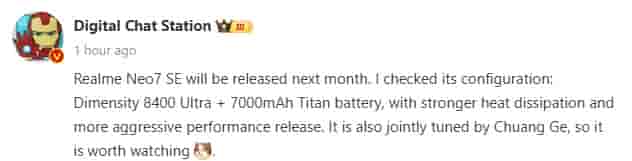 Along with this, tipster Digital Chat Station has also shared a few details concerning Realme’s next Neo 7 series model. As per what has been shared, the tipster notes that apart from the MediaTek Dimensity 8400 Ultra chip, the device is also believed to pack a 7000 mAh massive battery, just like the already unveiled Neo 7 model, and it would possibly feature greater heat dissipation and aggressive performance release capability. Additionally, the upcoming device is also pointed out to be tuned by Chuang Ge.
