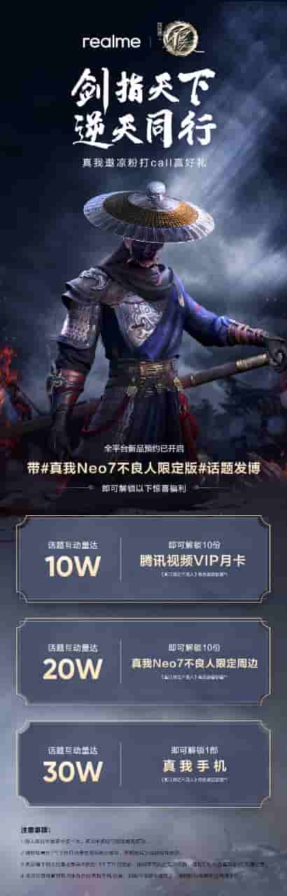 Weibo users who post on the topic #TrueMyNeo7BadPeopleLimitedEdition# can unlock the following surprise benefits: topic interaction volume reached 10W- unlock 10 Tencent Video VIP monthly cards, topic interaction volume reached 20W-unclock 10 exclusive Neo 7 Bad Guys peripherals, topic interaction volume reached 30W- unlock 1 Realme phone.