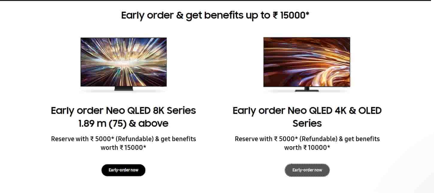 Those who want to buy these TVs with great deals can pre-order and get benefits up to Rs 15,000. The Neo QLED 8K series(75 inches and above) can be reserved for Rs 5000 and can get benefits up to Rs 15,000. And buyers can pre-order the NEO QLED 4K and OLED Series for Rs 5000 which will get benefits up to Rs 10,000. The pre-order can be made through Samsung’s official site or Samsung App. It is exclusively available only through the Samsung gateways.
