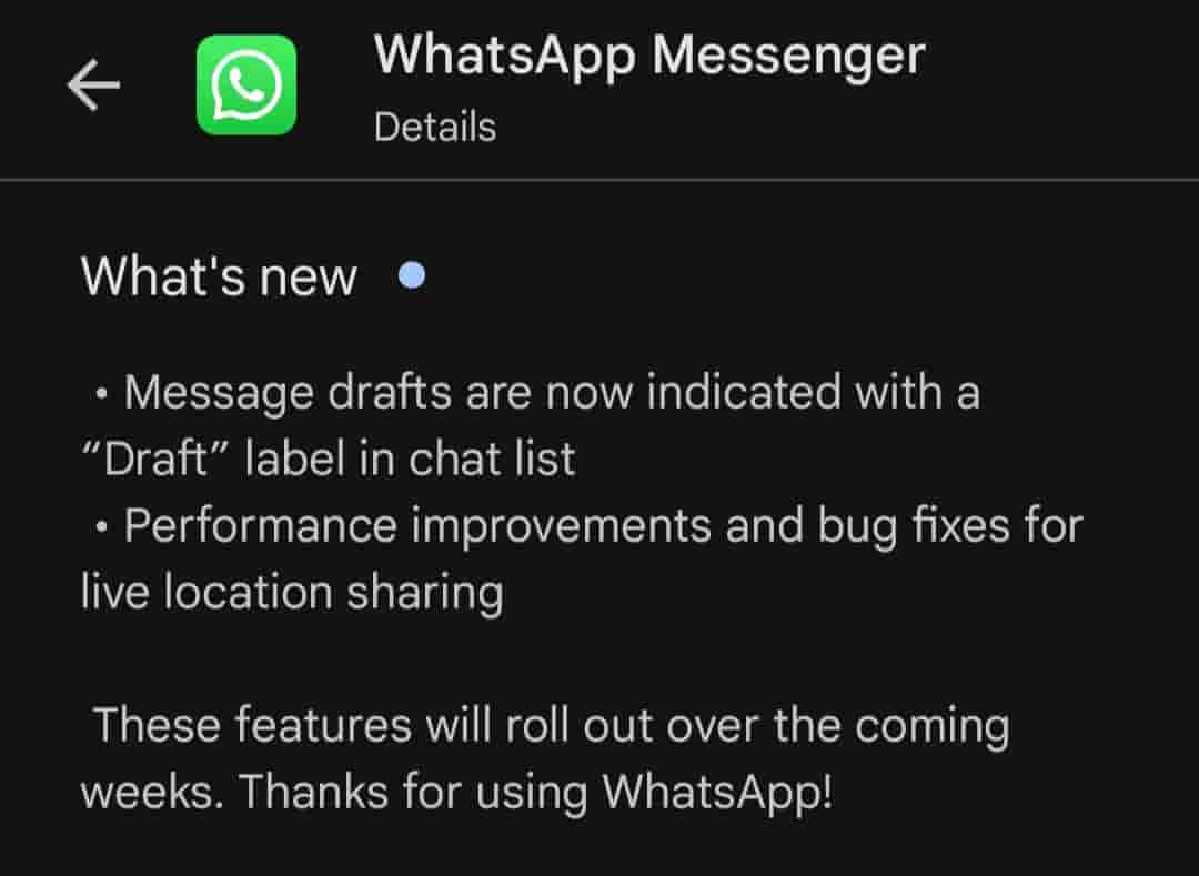 As seen in the above image, on Google Play Store the update is available for Android users. With this update Message drafts are now indicated with a Draft label in the chat list. This feature is made available for iOS users as well via a new update through the App Store.
