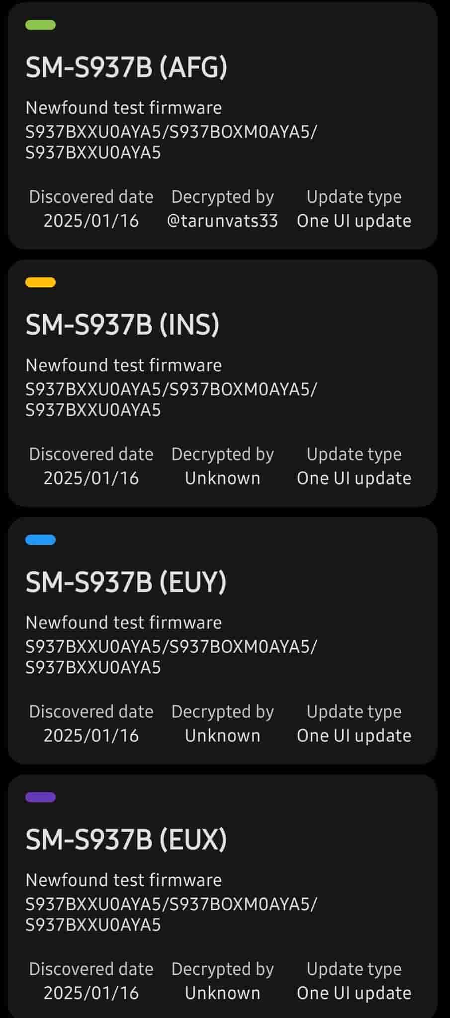 As per the new update, the first One UI 7 test build of Samsung’s soon-to-be-unveiled Galaxy S25 Slim device with model number – ‘SM-S937B’ have been spotted, in Europe, UAE, India, and few other Asian countries. The firmware build version is also revealed to be ‘S937BXXU0AYA5/ S937BOXM0AYA5/ S937BXXU0AYA5’.