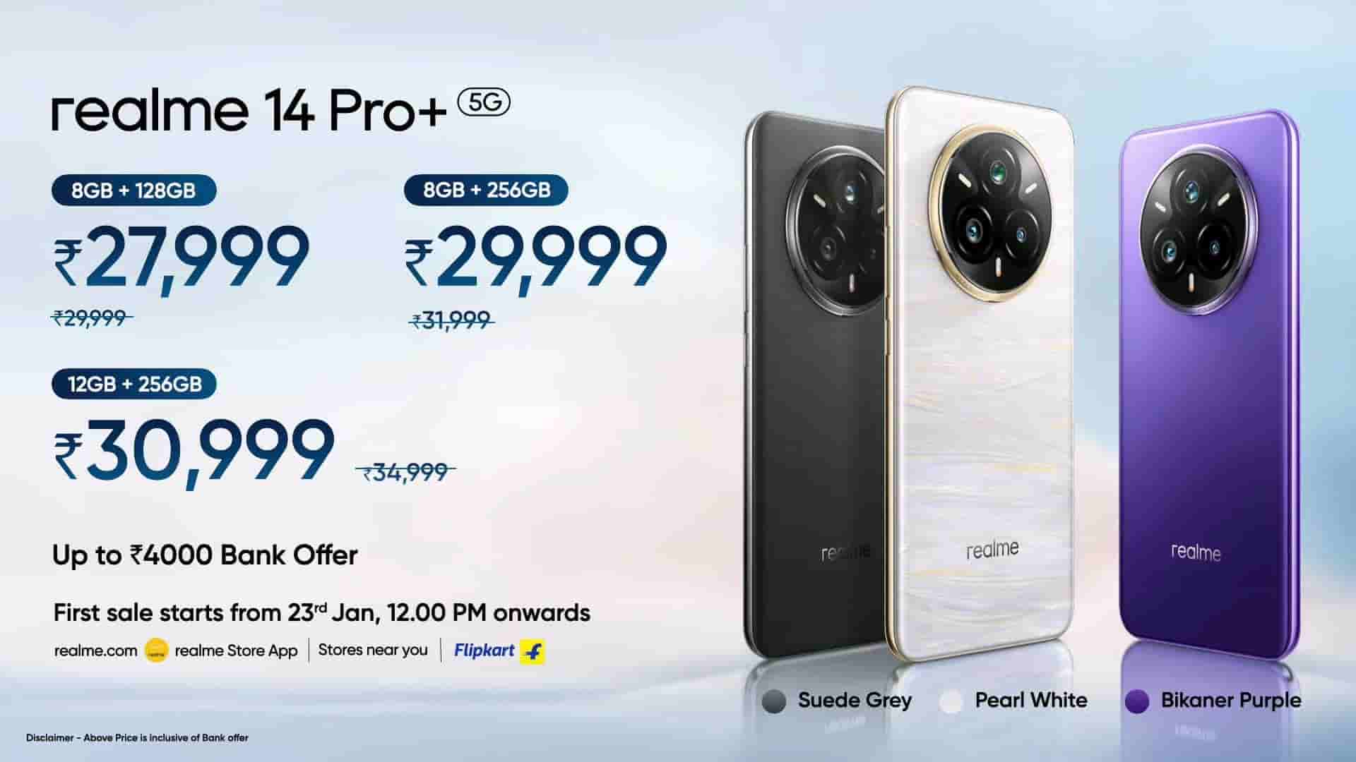 The Realme 14 Pro+ 5G has price tags of INR 27,999 (actual list price – INR 29,999), INR 29,999 (actual list price – INR 31,999), and INR 30,000 (actual list price – INR 34,999) respectively for the 8GB/128GB, 8GB/256GB, and 12GB/256GB storage variants (with up to INR 4,000 bank offer). The first sale will start on the 23rd of January 2025, at 12PM onwards, and it can be purchased via Flipkart, Realme official website, Realme stores, and also through other offline retail stores. Three color choices are available – Suede Grey, Pearl White, and Bikaner Purple.