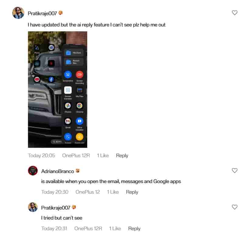 In the same community thread, one user reported issues with the AI reply feature. While some users offered suggestions about whether it works on messaging, Gmail, or Google apps, it appears the feature is not working on the Indian version of OnePlus 12R. If you are experiencing the same issue, feel free to tag us on X.
