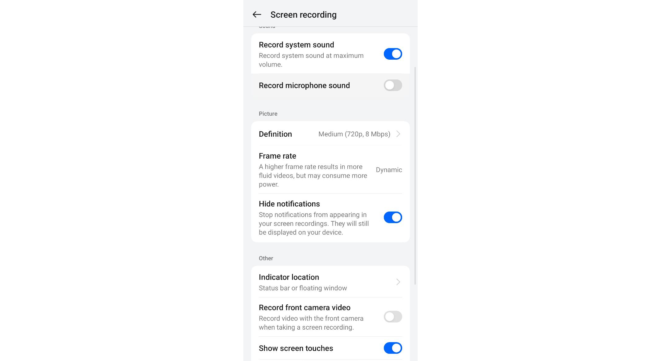 - Go to Settings > Additional settings > Screen recording or pull down the Quick Settings and long press Screen recording to enter the interface