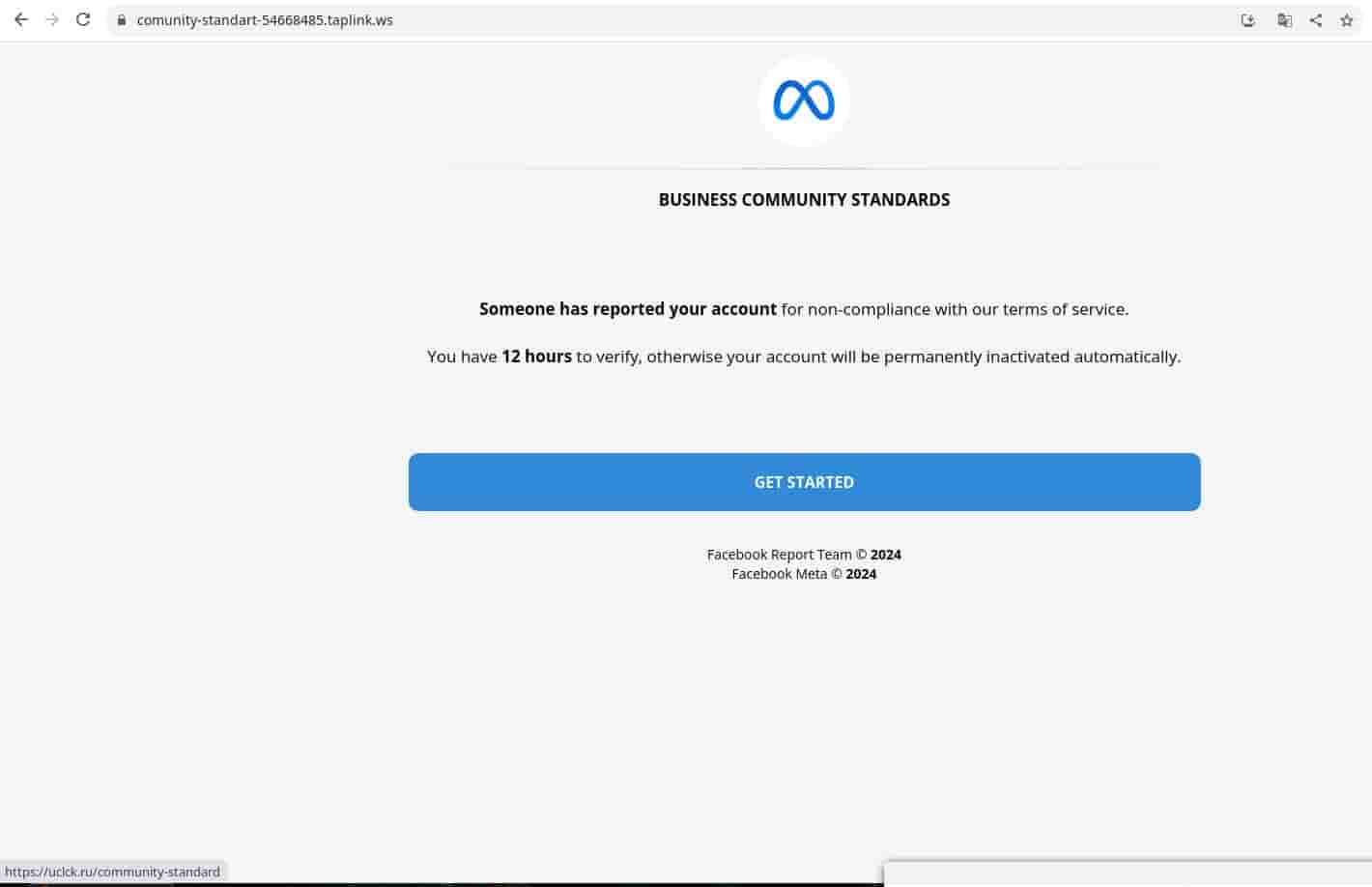 The notification contains more details, alleging that the account and page are to be blocked because someone complained about their non-compliance with the terms of service. If you follow the given link to solve the dispute, a website opens bearing the Meta logo with roughly the same message, but the time granted to solve the issue has been halved to 12 hours.