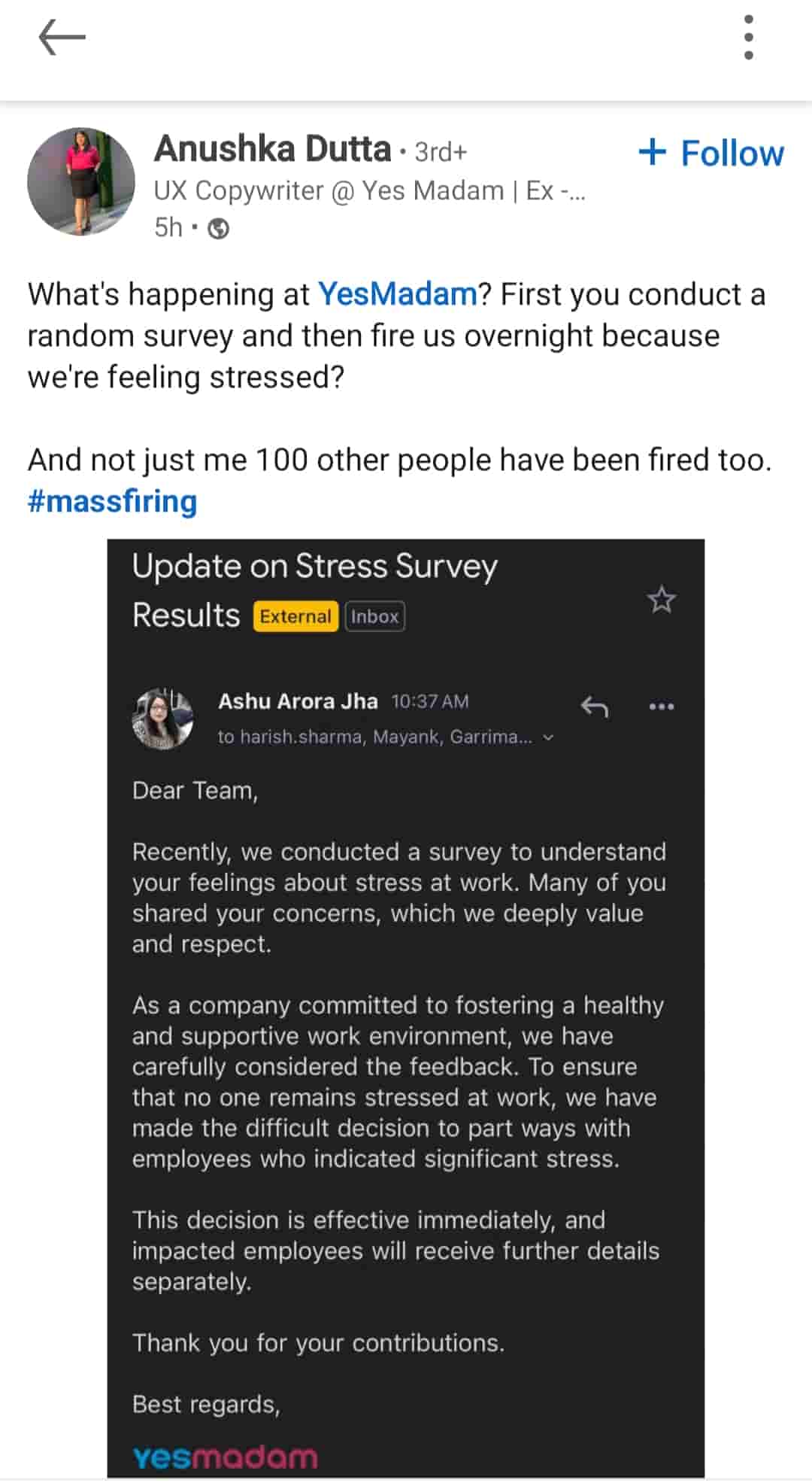 Yes Madam Company Fires Over 100 Employees After Stress Survey Results: Sparks Controversy Online
