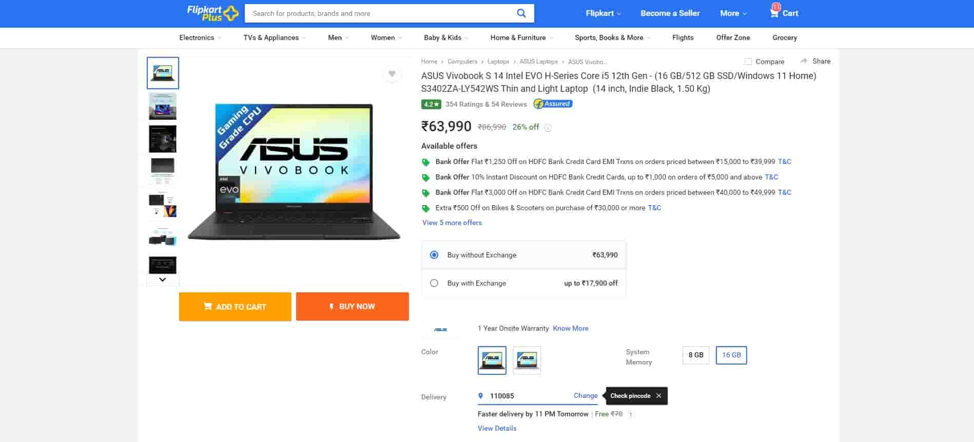 The Asus Vivobook S 14 Intel EVO H-Series Core i5 12th Gen laptop is available to buy from Flipkart at Rs 63,990, which is 26% off the retail price of Rs 86,990. This laptop has a 4.2-star rating on Flipkart.