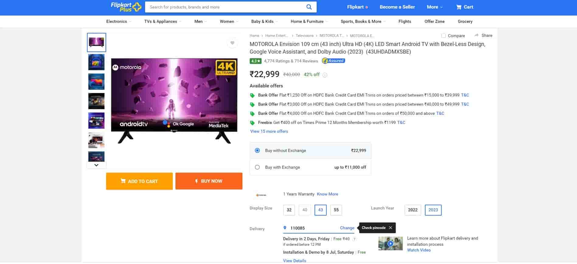 Flipkart offers Motorola Envision 43-inch Ultra HD (4K) LED Smart Android TV at 42 % discount, buy it for Rs 22,999