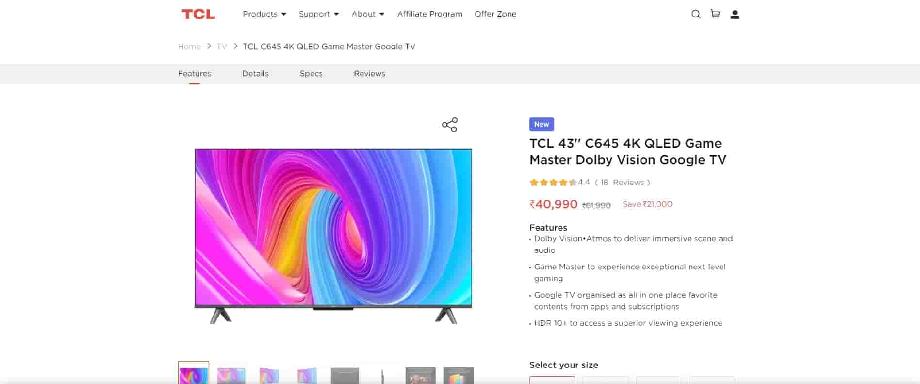 The TCL 43-inch C645 4K QLED Game Master Dolby Vision Google TV is available to buy from the official site of TCL at Rs 40,990, which is a discounted price from the retail price of Rs 61,990. With this deal, you’ll save Rs 21,000.