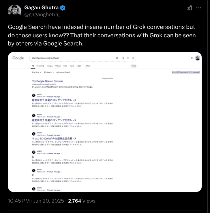 Google Search has indexed an insane number of Grok conversations but do those users know - X Post