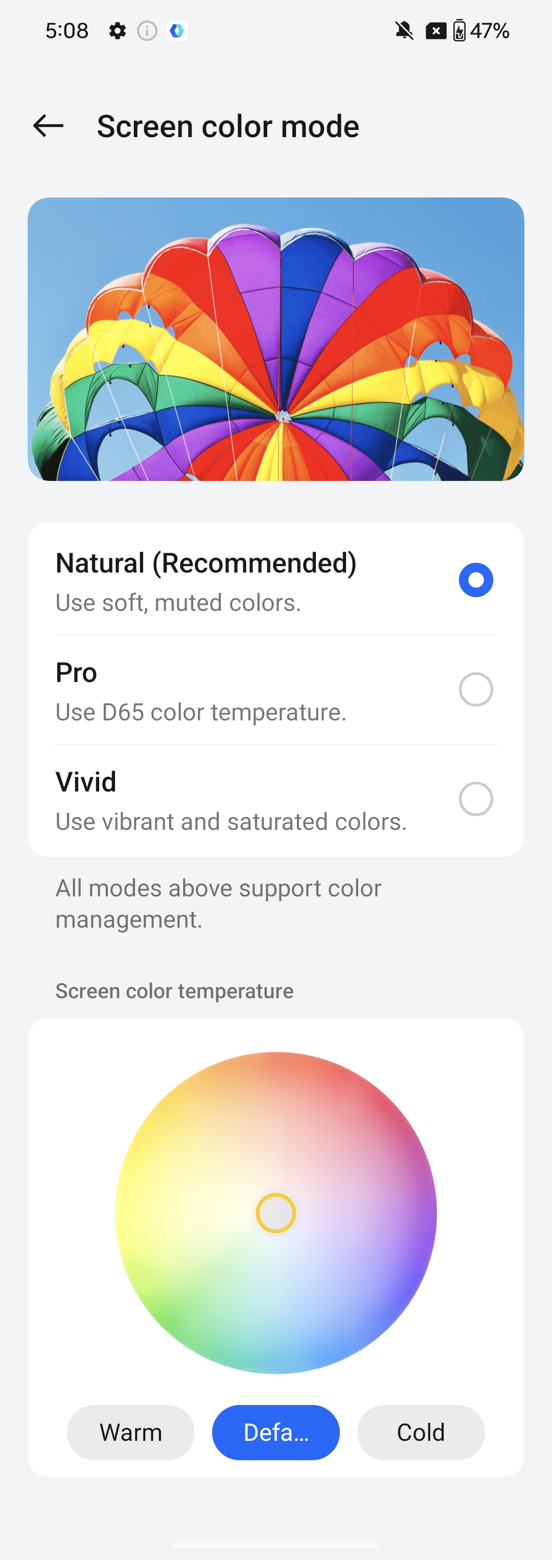 Setting > Display & brightness > Screen color mode