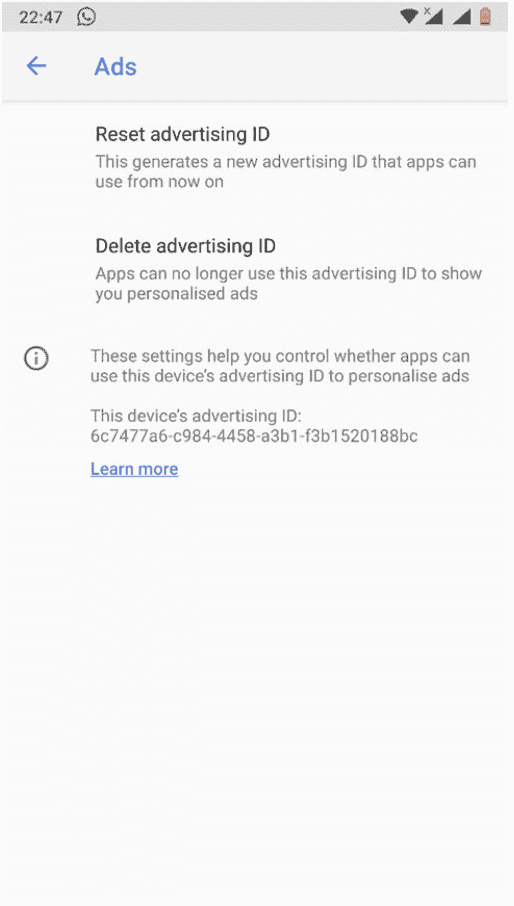 3. Delete advertising ID or enable the Opt out of Ads Personalization option.
