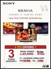 Sony is offering exciting deals on its latest Bravia television series that includes exciting cashback of up to Rs.25,000 along with 3 year comprehensive warranty on selected models. Customers can also avail one free EMI scheme on selected Bravia models. Sony is also offering single combo EMI scheme for televisions and soundbars starting from Rs.2,995 with discounts up to Rs.64,990 on Bravia TV and soundbars.