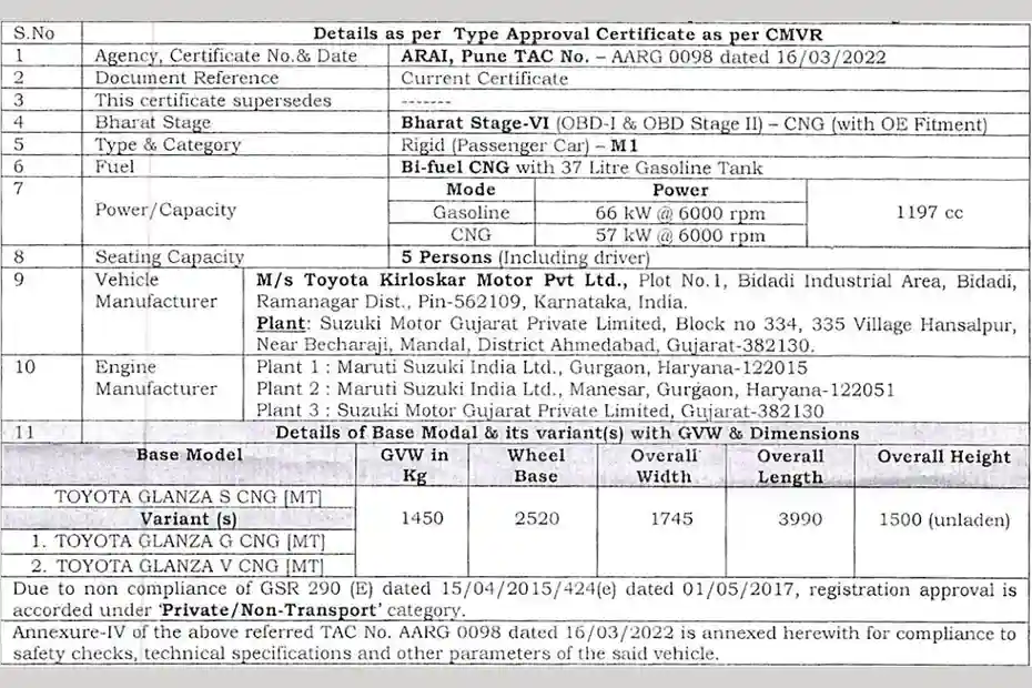 It’s been quite a long time since Toyota has been working on the CNG variant of Glanza and seems to have approached close to unveiling it in front of people who have been eagerly waiting. Type Approval Certificate revealing issued by RTO Delhi to Toyota reveals the feature that it would be coming within the market to set a mark. Its features stated in the document reveal that the Toyota Glanza can be a premium CNG hatchback that would surpass the popularity of even its counterpart, the Maruti Baleno.