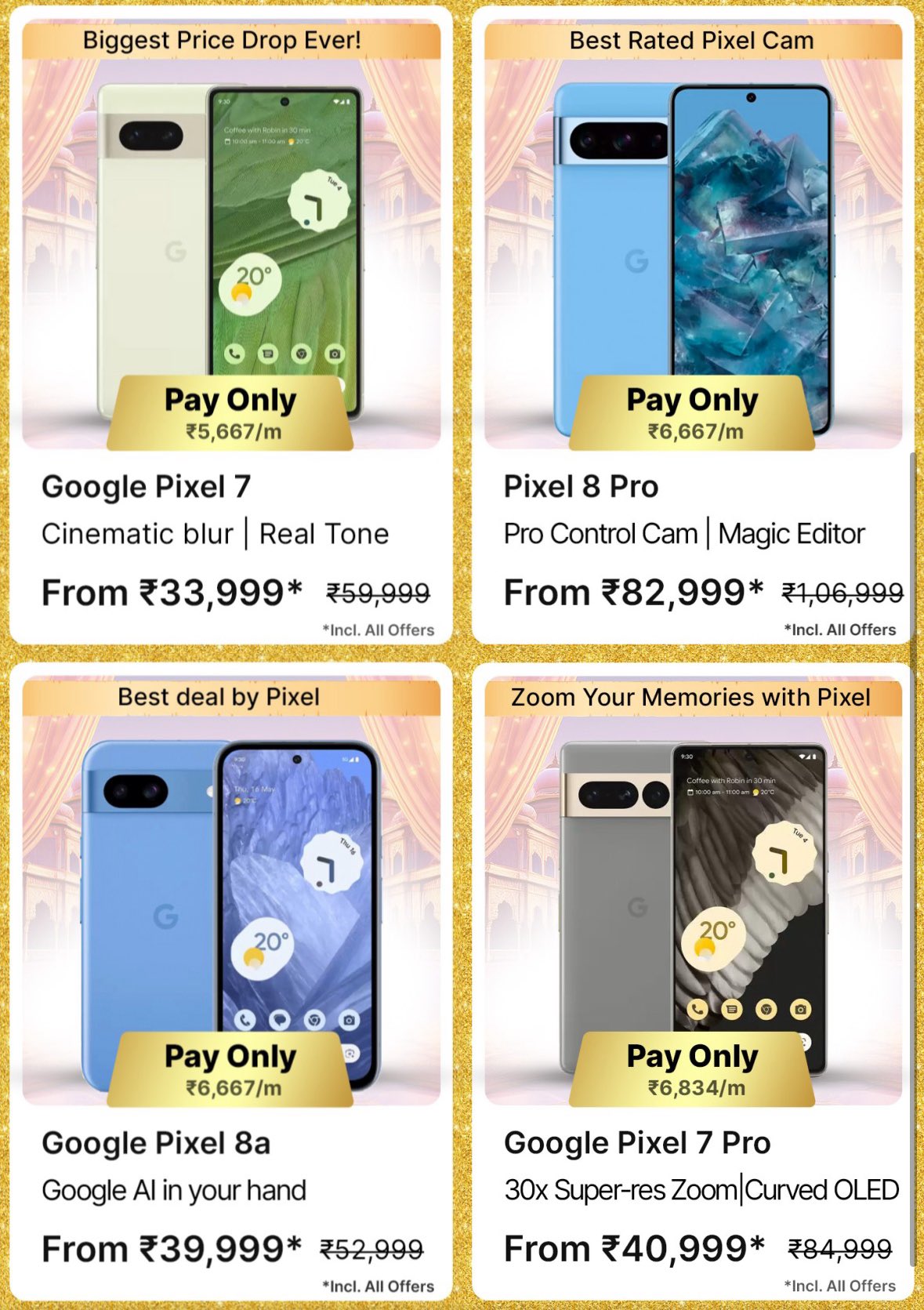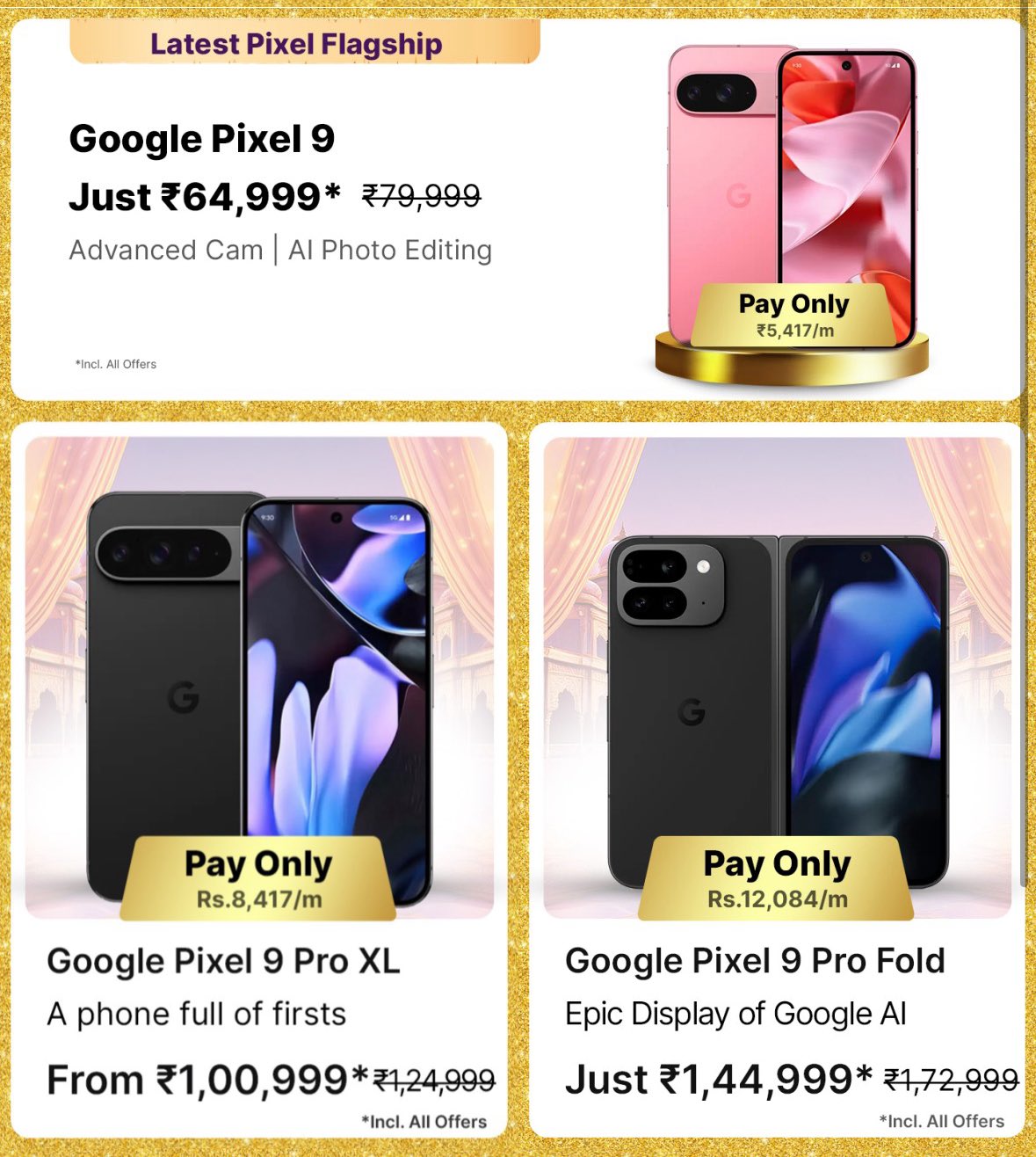 Recently launched Google Pixel 9 series smartphones will also be available at a discounted price. Google Pixel 9 came with the price of Rs.79,999 though it will be available for Rs 64,999. The Google Pixel 9 Pro XL smartphone that came with the price of Rs.1,24,999 will be available for Rs 1,00,999. And Google Pixel 9 Pro Fold smartphone which came with the price of Rs 1,72,999 will be available for Rs 1,44,999.
