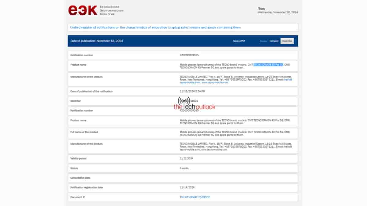 It is the Camon 40 Pro 5G and Camon 40 Premier 5G models that have been listed on the EEC database, and they carry the model numbers – ‘CM7’ and ‘CM8’ respectively as per the listing. The two have received the EEC certification with the notification number – ‘KZ0000009285’, and the certification validity will be till the 31st of December 2034.