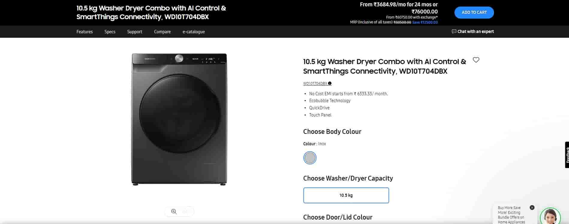 It’s 10.5 Kg capacity washer-dryer combo is available on Samsung’s official website for RS 76000. It is also available on EMI option starting from Rs 3684 per month for 24 months. The exchange offer can be got off up to Rs 15,250.
