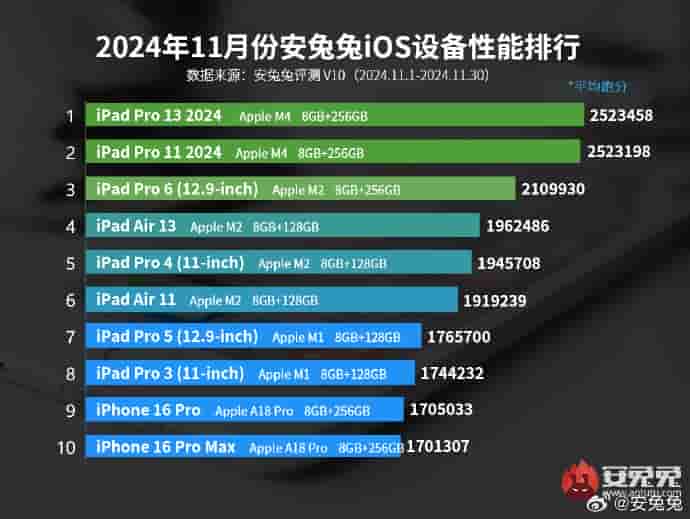 Finally regarding the AnTuTu November 2024 ranking of iOS devices, the iPad Pro 13 2024 (8GB/256GB) with Apple M4 chip has achieved the first position with 2,523,458 points. The iPad Pro 11 2024 (8GB/256GB) with the same Apple M4 chip and iPad Pro 6 12.9″ (8GB/256GB) with the Apple M2 chip ranks second and third, scoring 2,523,198 points and 2,109,930 points respectively. The iPad Air 13, iPad Pro 4, iPad Air 11, iPad Pro 5, iPad Pro 3, iPhone 16 Pro, and iPhone 16 Pro Max are the other subsequent devices on the list.
