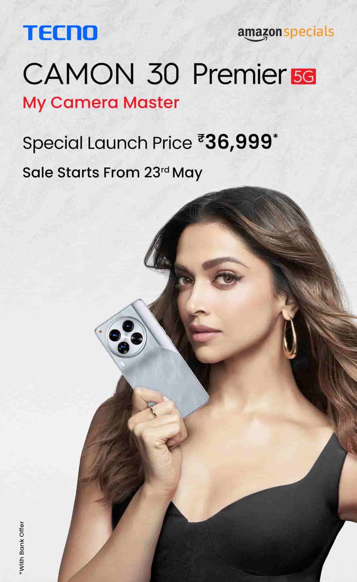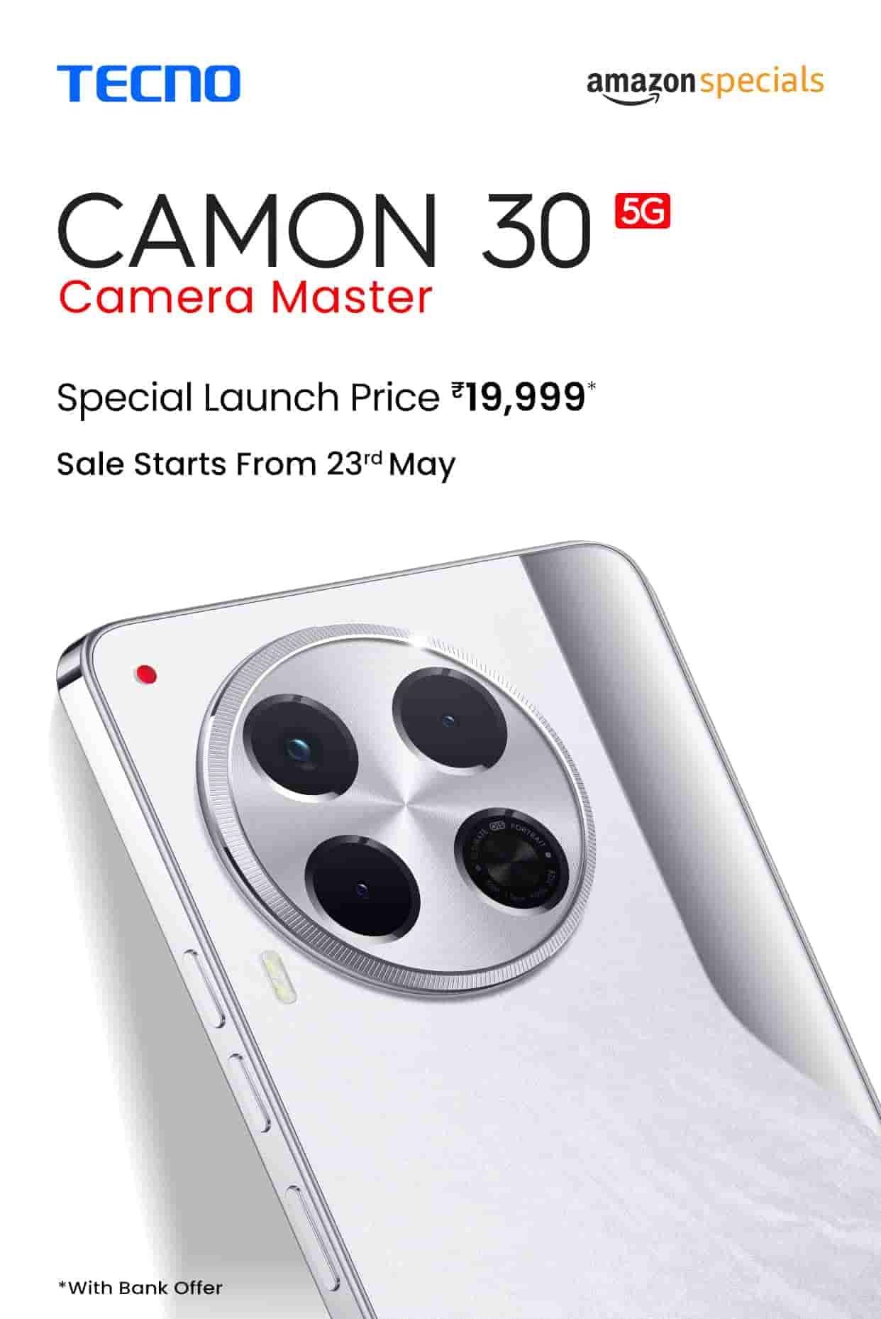 The Tecno Camon 30 Premier 5G smartphone is priced at 47,999 but will be available at Rs 39,998 and with a 3,000 bank discount on ICICI Credit Card, and a free AMOLED Smartwatch worth Rs 4,999 the effective cost becomes Rs 31,999. EMI option starting from Rs 88/day is also available on it. The sale of both of the smartphones will begin on 23rd May and will be available on Amazon for buyers.